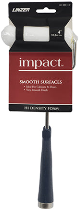 4" white foam roller with frame. 3/8" nap, high density foam. 11" long slip on roller frame. 1/4" rod. Metal ferrule. Threaded plastic grip handle. For gloss and semi-gloss paints. For use on smooth surfaces.